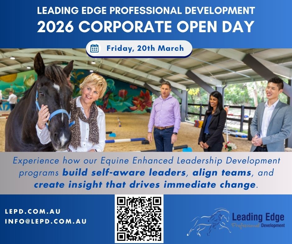 We are delighted to invite you to the 2026 Leading Edge Professional Development Corporate Open Day. Join us Friday, 20 March for an immersive introduction to Equine Enhanced Experiential Learning as a powerful professional development tool. You’ll see how this approach builds leadership capability, strengthens teams, and creates insight that lasts.